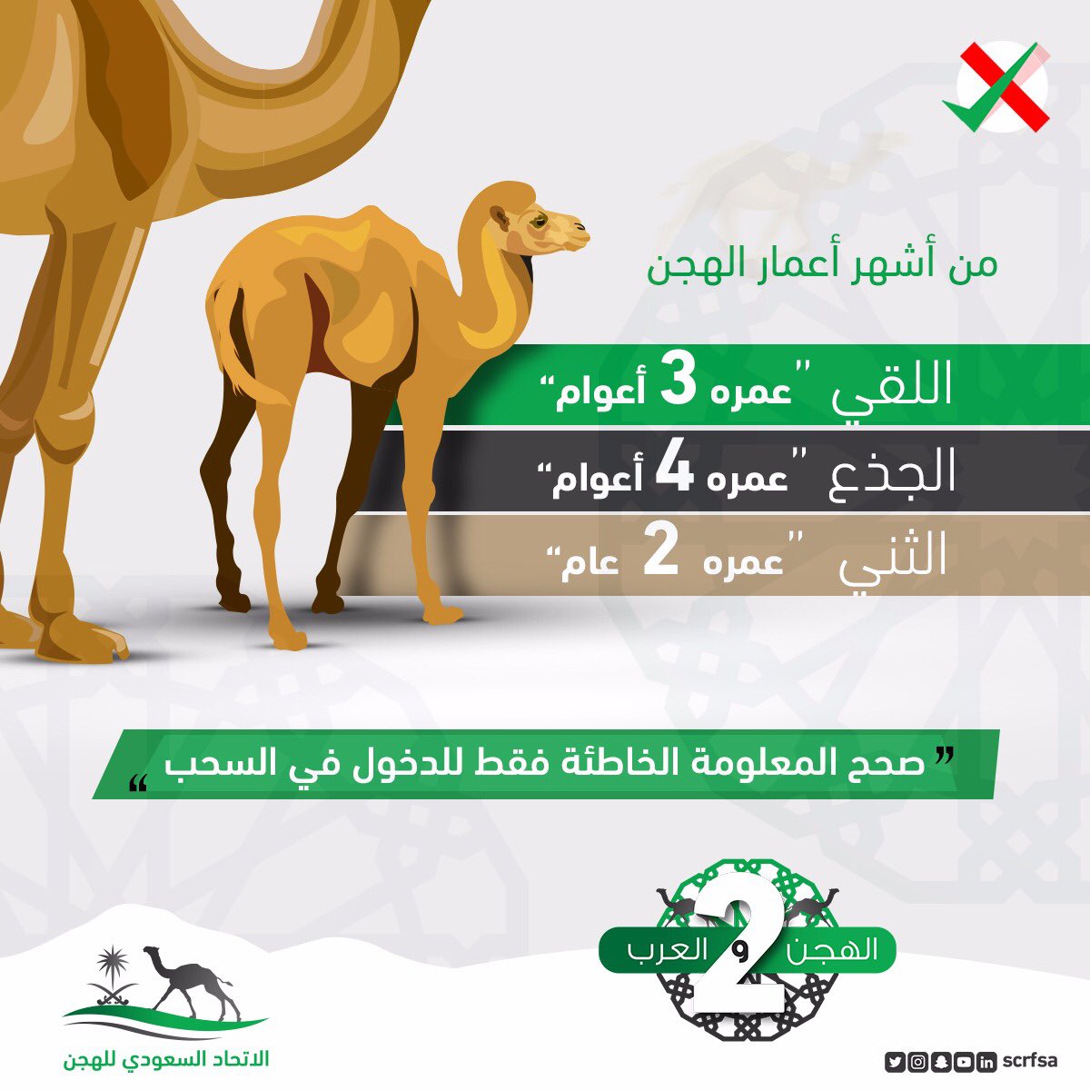 الاتحاد السعودي للهجن على تويتر مسابقة الاتحاد السعودي للهجن السؤال الرابع صحح المعلومة التالية من أشهر أعمار الهجن اللقي ٣ أعوام الجذع ٤ أعوام الثني عامان ريتويت للتغريدة متابعة الحساب