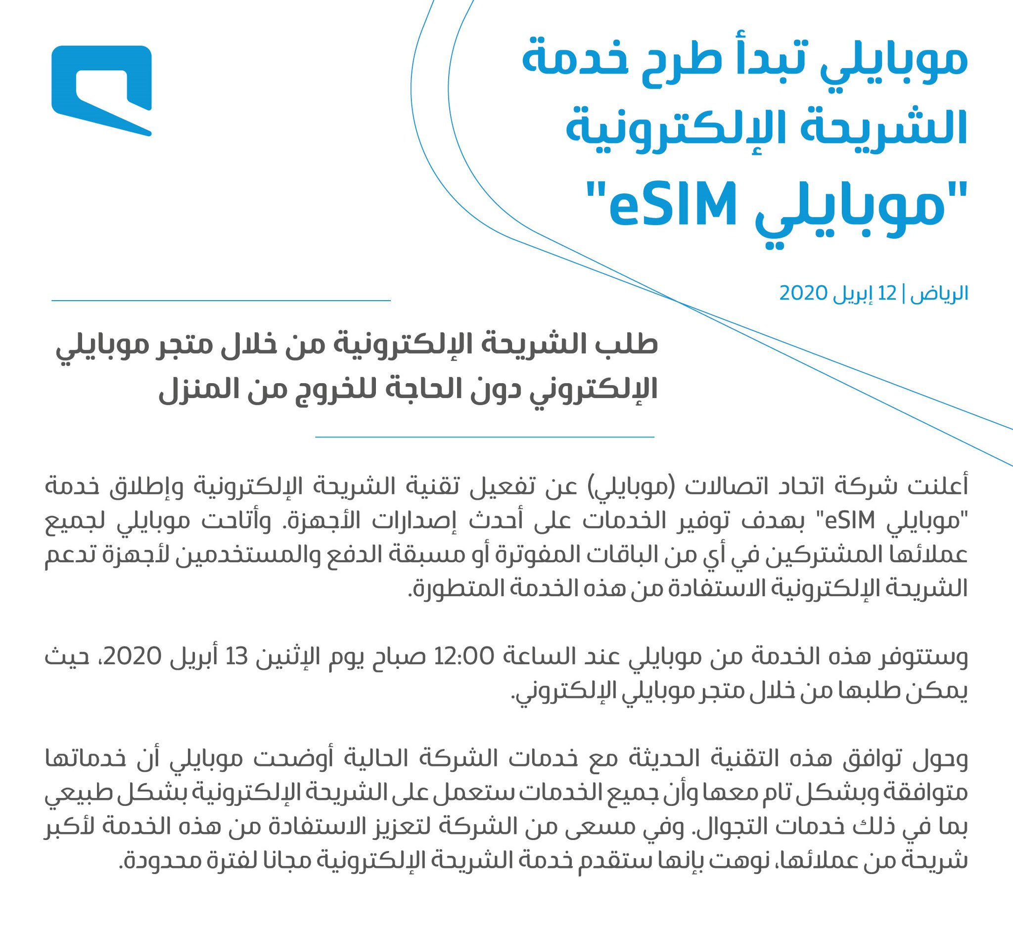 موبايلي On Twitter موبايلي تبدأ طرح خدمة الشريحة الإلكترونية Esim عبر متجرها الإلكتروني عند الساعة 12 صباح يوم الإثنين 13 أبريل