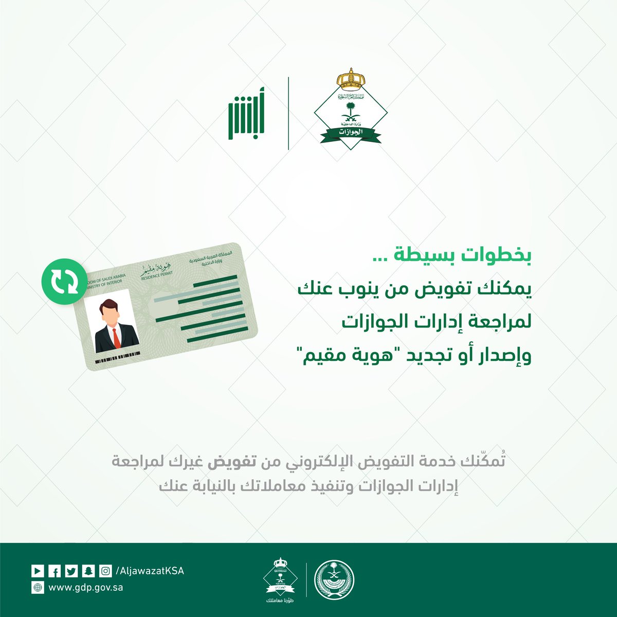 الجوازات السعودية A Twitter تحقيقا لأهداف خطة الجوازات الاستراتيجية تساهم خدمة التفويض الإلكتروني على توفير الوقت والجهد حيث تمك ن المستفيدين من تفويض من ينوب عنهم لمراجعة إدارات الجوازات لإنهاء إجراءاتهم Https T Co P252svrqky