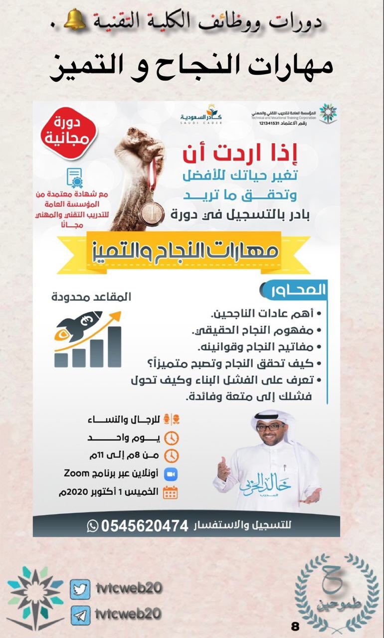 دورات ووظايف الكلية التقنية On Twitter دورات مجانية للدبلوم مهارات النجاح و التميز شهادة معتمدة من المؤسسة العامة للتدريب التقني والمهني الخميس 1442 2 14هـ الساعة 8 00 11 00مساء للتسجيل Https T Co Cmoz8dcc79 Https T Co