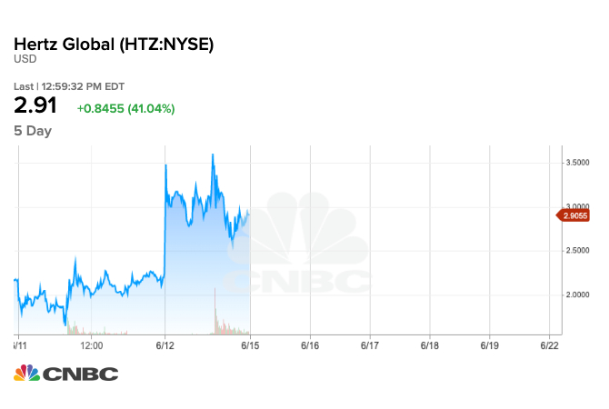 قناة Cnbc العربية سهم شركة Hertz الأمريكية يرتفع بأكثر من 40 في تداولات اليوم بعد أن طلبت الشركة من محكمة الإفلاس السماح لها بالاستفادة من الارتفاع المفاجئ في أسهمها من خلال