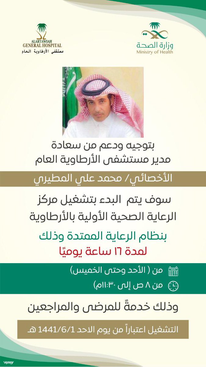Uzivatel مستشفى الارطاوية Na Twitteru مركز الرعاية الصحية الاولية بالارطاوية يعمل حتى الساعة 11 30 مسآء وكان ذلك بتوجية من سعادة مدير المستشفى الأخصائي محمد علي المطيري Https T Co Ilkieywms5